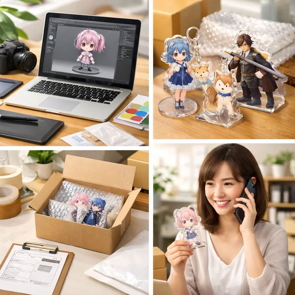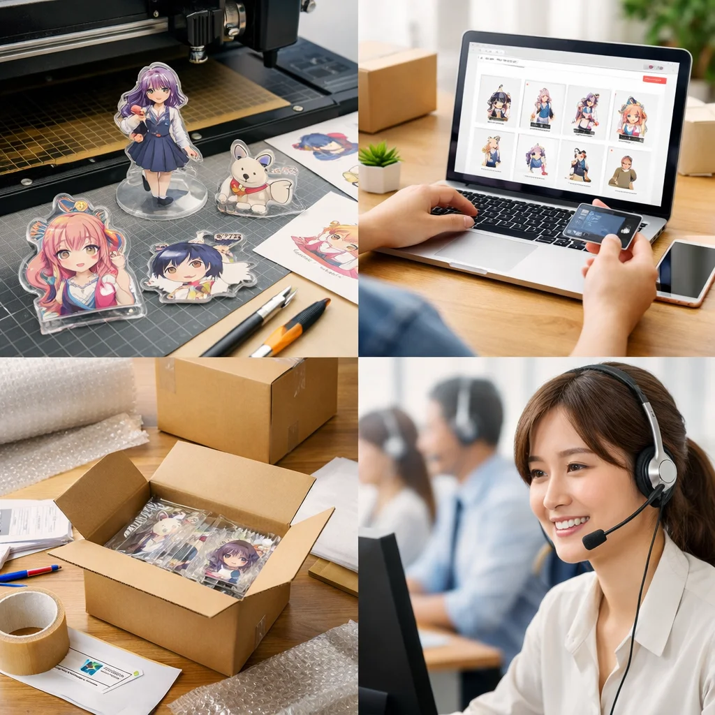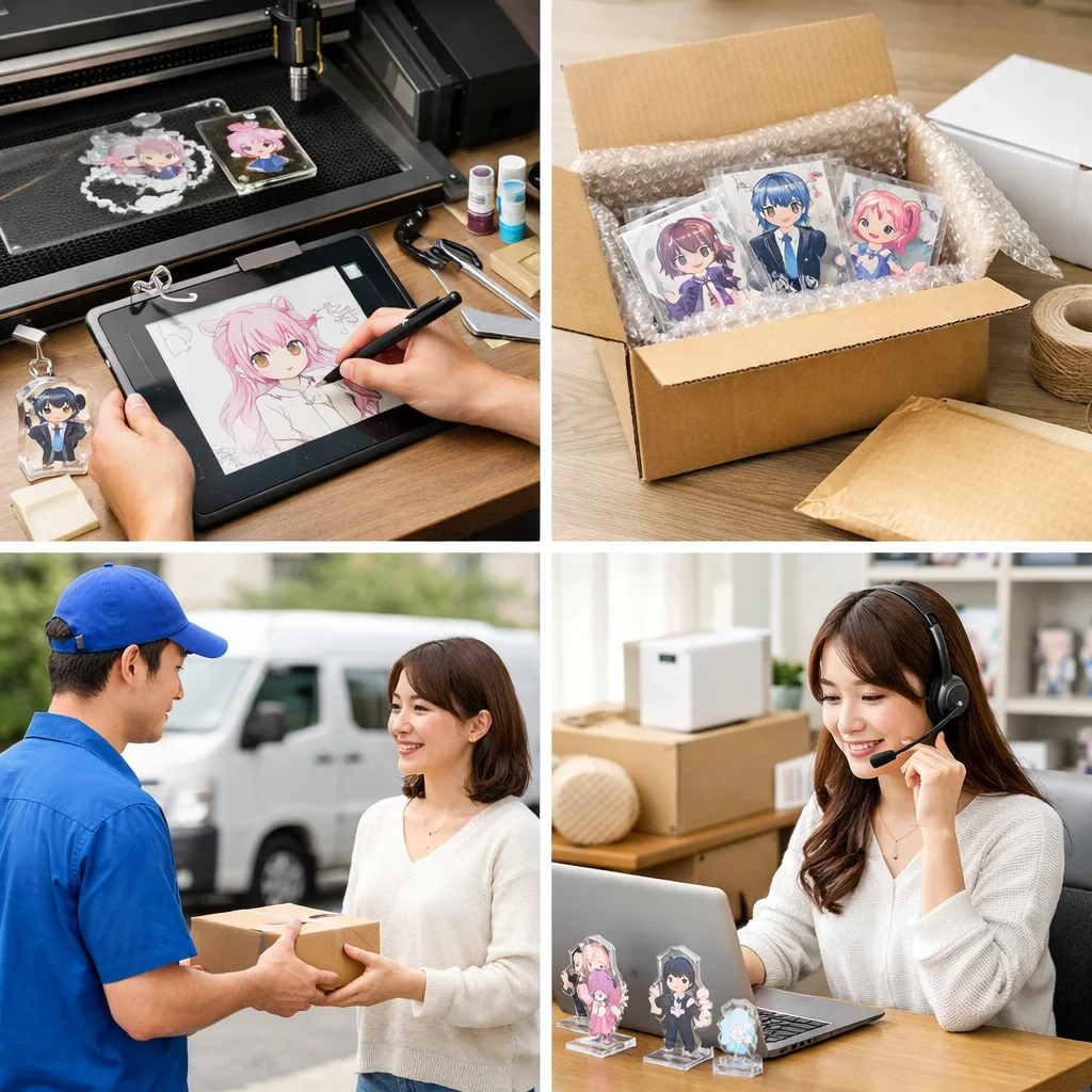 注文後のサポートやアフターサービスが充実しているサイトを選ぶと、安心してアクリルグッズ制作を進められます。例えば、アクリル彩では、デザインデータの作成から納品まで、スタッフがサポートしており、専門的な知識がなくても利用できます。 (参考: acrylsai.com)
